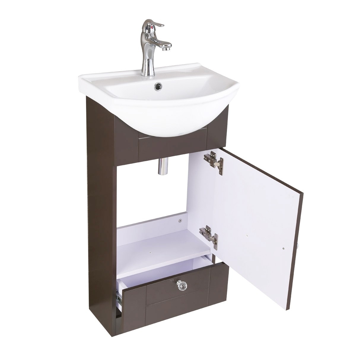 Small Bathroom White Brown Vanity Cabinet With Faucet And Drain